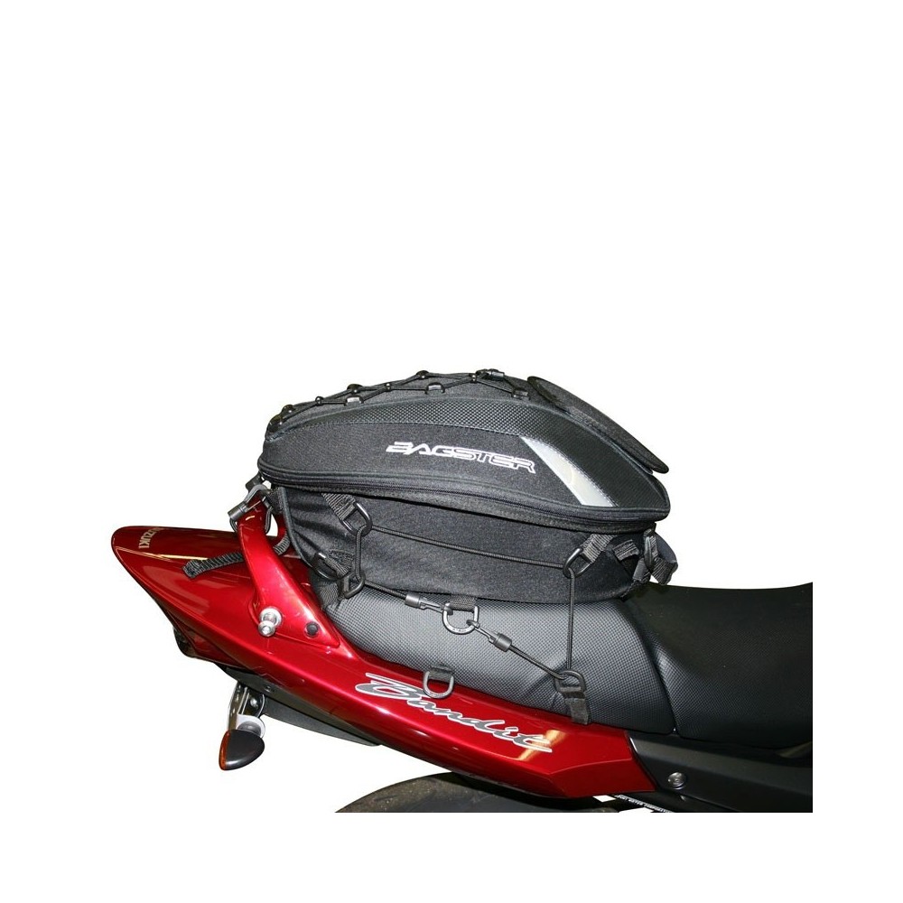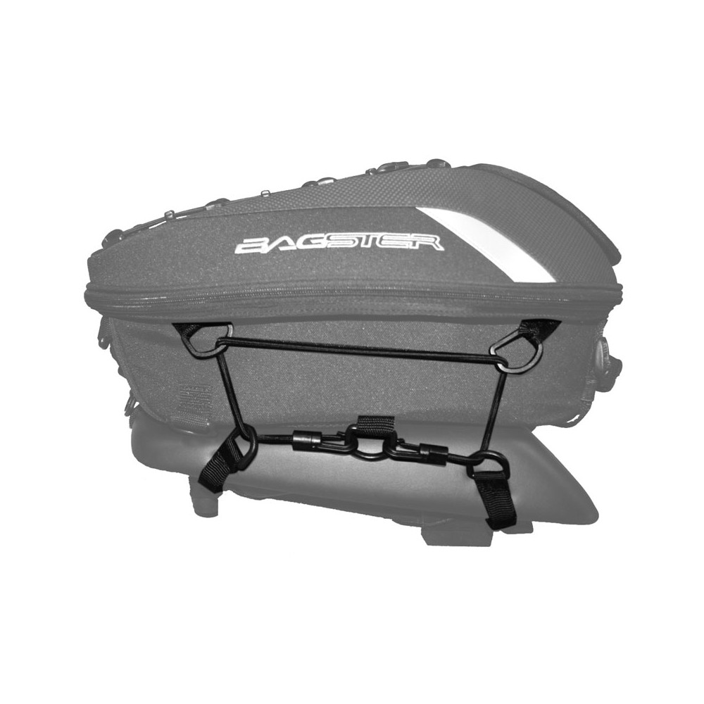 Fixation par des crochets métalliques et par un élastique placé sous la selle.