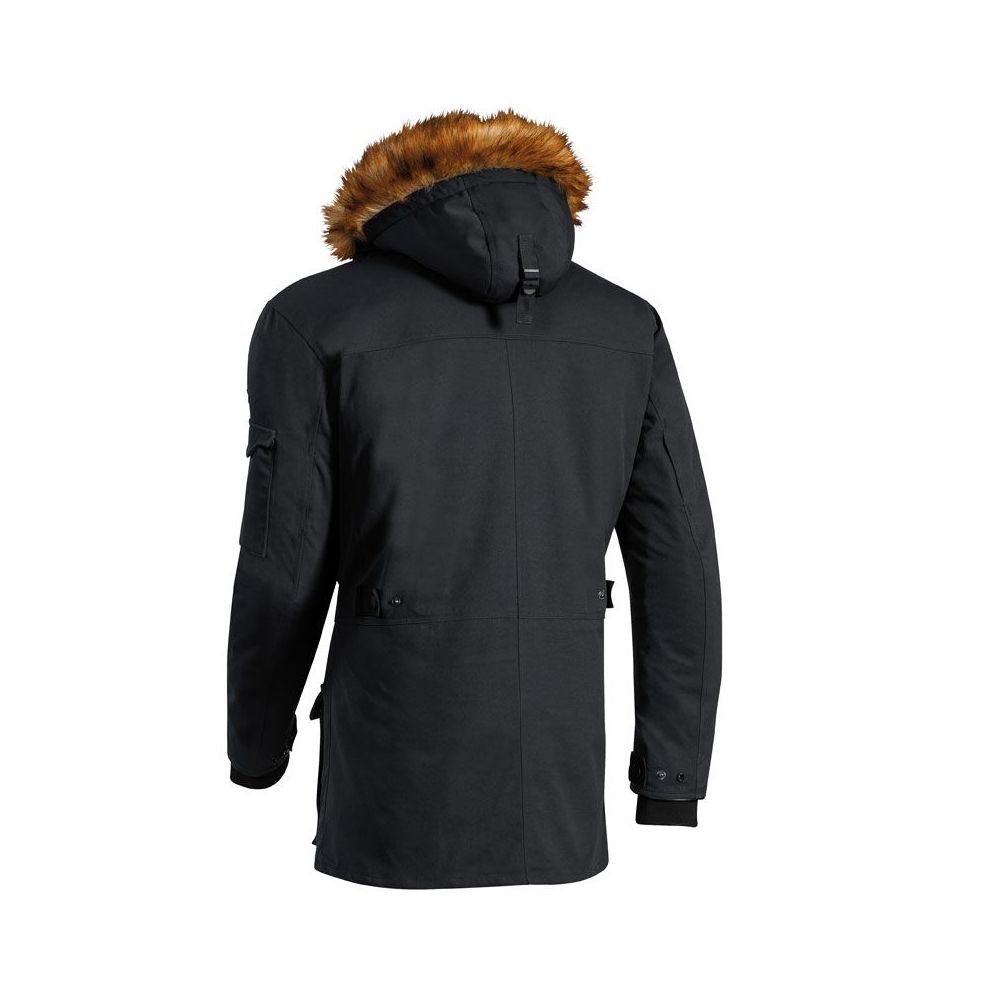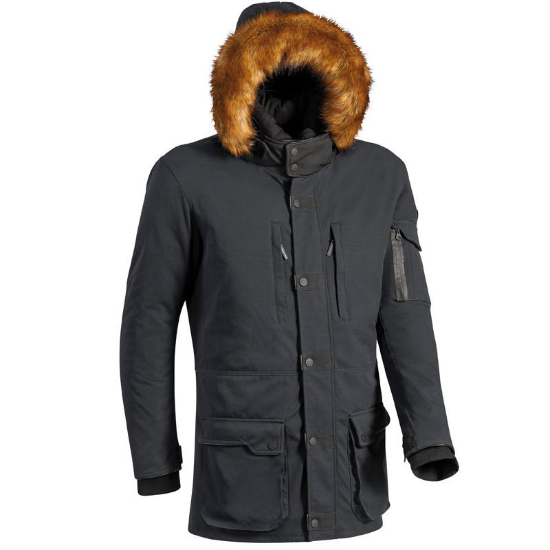 Veste moto homme très longue, couvrante et très chaude (90% polyester, 10% polyuréthane).